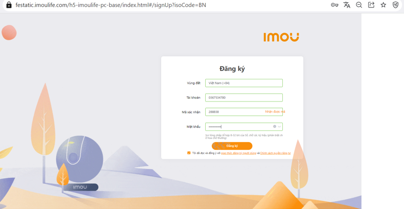 - Account: Nhập Sđt / tài khoản email của bạn. Sđt / email này dùng để nhận mã Code của IMOU gửi về để kích hoạt tài khoản và để sau này bạn lấy lại mật khẩu khi quên.
