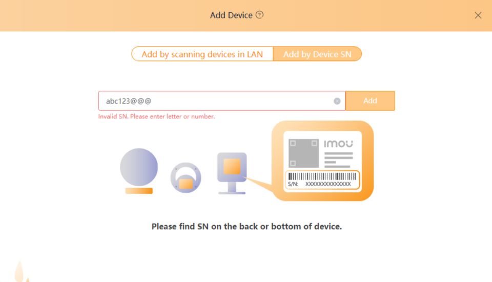 - Trường hợp 2: Camera IMOU và máy tính không dùng chung mạng internet thì bạn chọn “Add by Device SN” và chọn “Start Search” để thêm camera thủ công vào phần mềm IMOU Life. Với cách thêm này bạn chỉ cần nhập dãi ký tự SN phía dưới mã vạch của camera IMOU là được.
