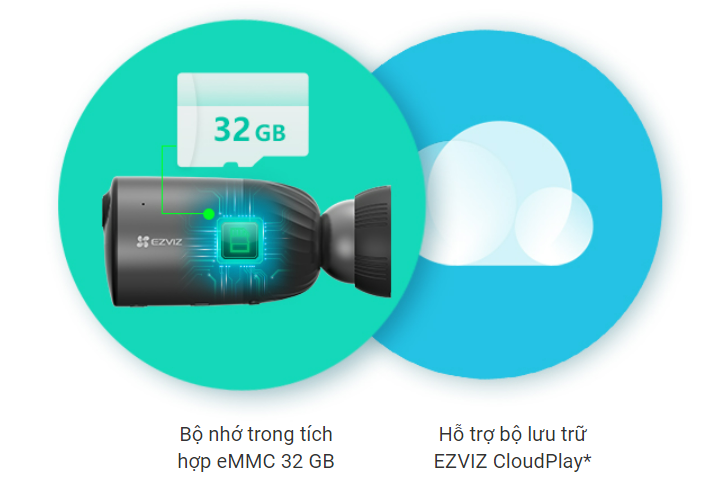 BC1C được tích hợp với bộ nhớ trong eMMC 32 GB, có nghĩa là bạn không cần phải trải qua bất kỳ cài đặt phức tập nào hoặc chi phí thêm cho các thẻ lưu trữ ngoài. Bạn cũng có thể chọn lưu dữ liệu của mình vào Ezviz CloudPlay khi đăng ký dịch vụ, để tăng cường mức độ bảo vệ trong trường hợp thiết bị bị hư hỏng hoặc mất mát.