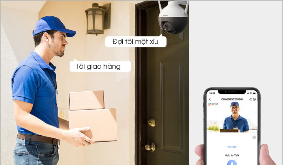 Có thể giao tiếp front-door từ xa. Với C8W, bạn có thể nghe và nói chuyện với người nhà, chào đón khách đến thăm hoặc từ chối những vị khách không mời mà đến thông qua ứng dụng dụng Ezviz trên điện thoại thông minh của mình.